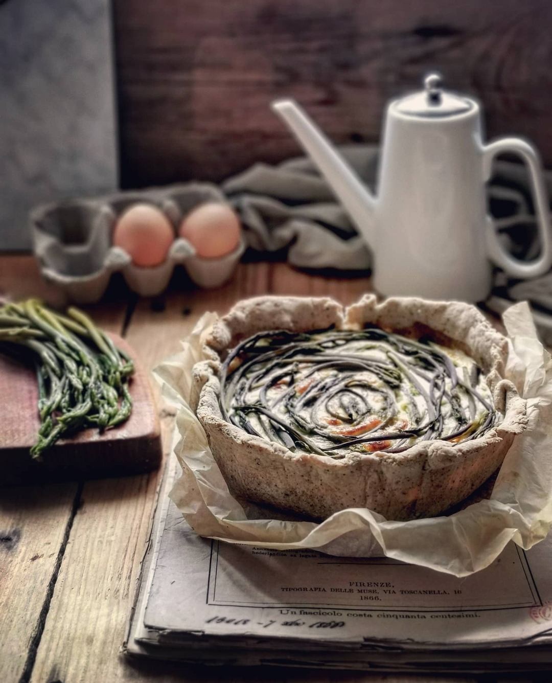 una torta salata vista da davanti, posata su un piano di legno, con a lato un mazzo di germogli cotti e sul fondo una oliera e due uova