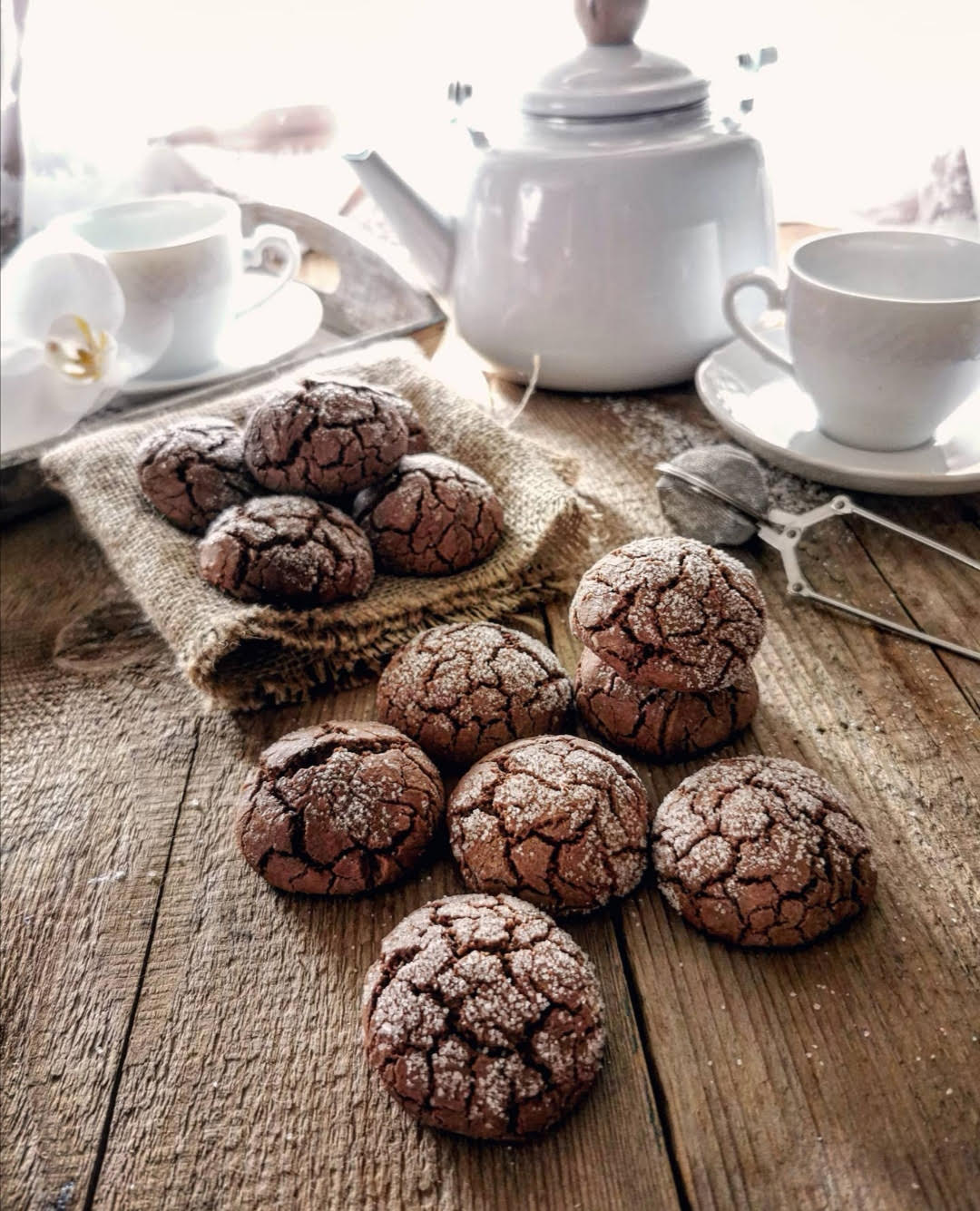 biscotti al cioccolato su un tavolo di legno, una tazza e una teiera bianca sullo sfondo