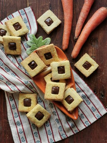 biscotti di frolla alle carote senza glutine quadrati e farciti di crema alle nocciole, con a lato delle carote