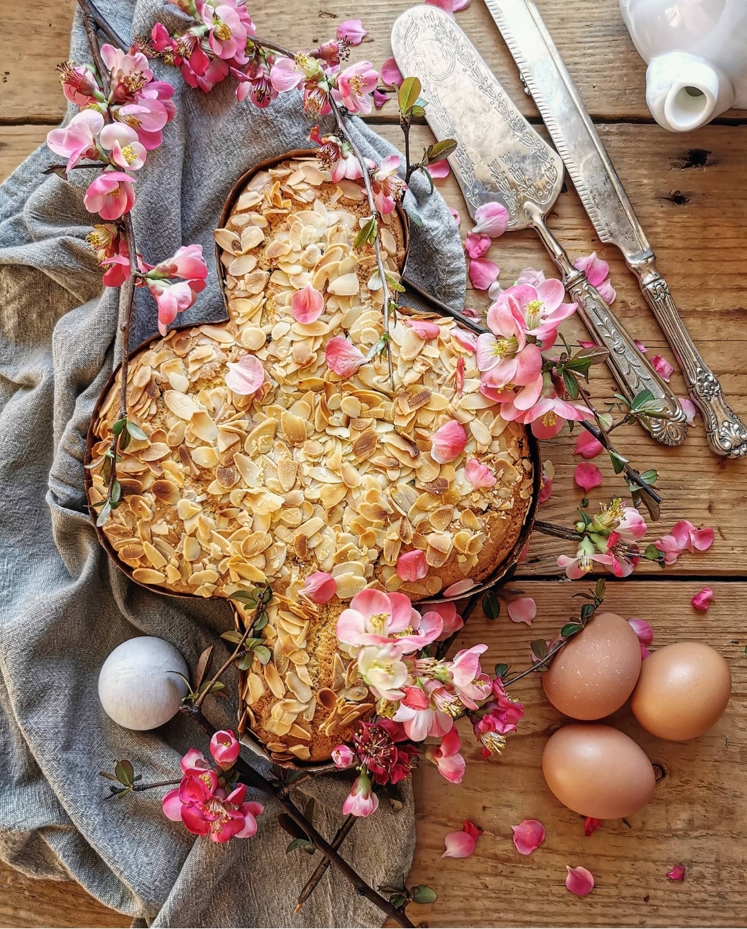 - Sulla superficie della colomba poggiate delicatamente le scaglie di mandorle ( e mandorle pelate intere) e la granella di zucchero. Infornate nel forno già caldo preriscaldato a 180 gradi per circa 40 minuti.
