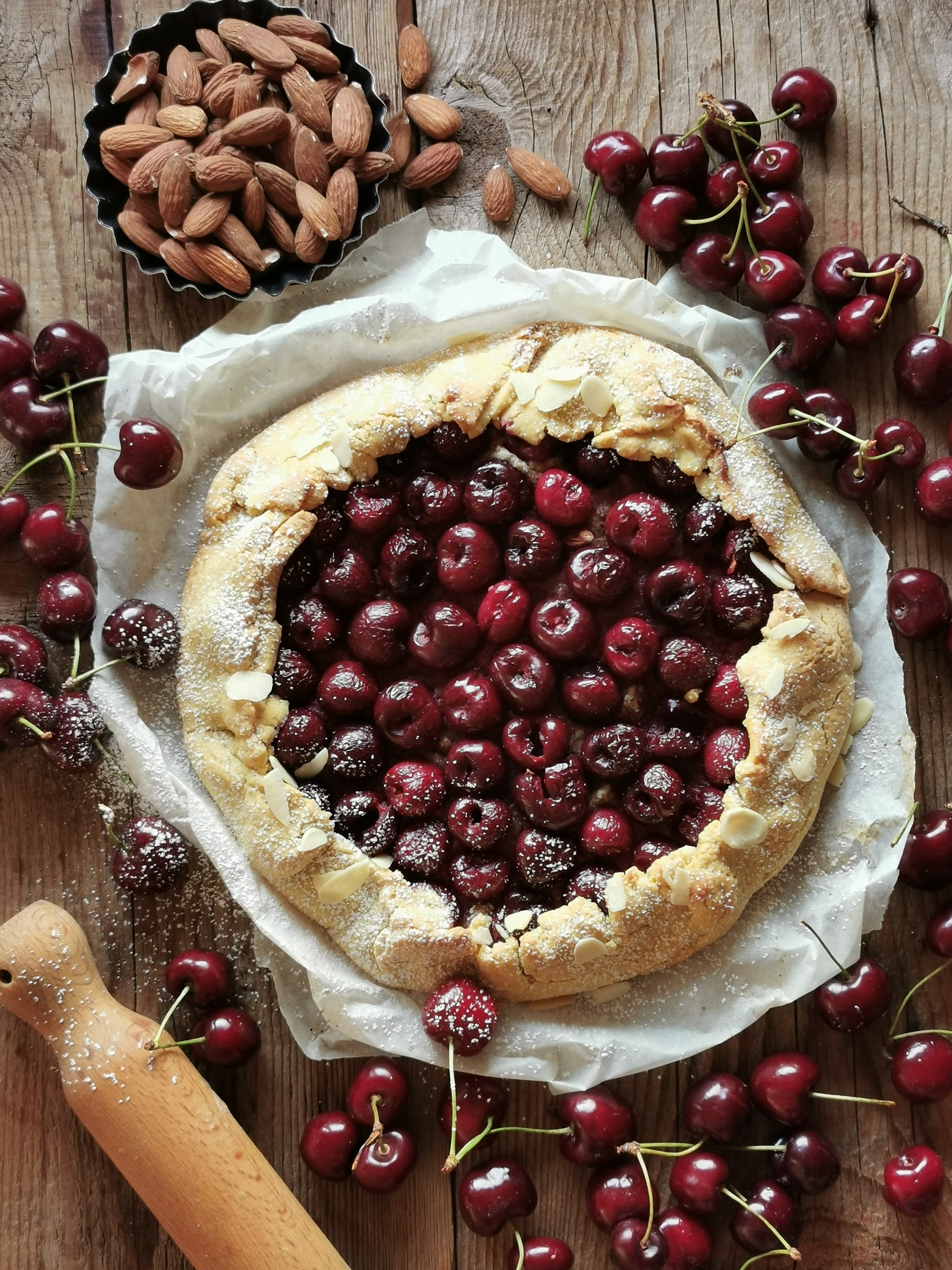 - Preparate la pasta versando in una ciotola le farine con lo zucchero. Unite il burro morbido e l’acqua ghiacciata. Impastate velocemente fino ad ottenere un panetto. A bisogno aggiungete e spolverate la pasta con altra farina. Lasciate riposare la pasta in frigo mentre vi occupate della farcia. Snocciolate tutte le ciliegie con l’apposito strumento o una cannuccia, in modo da togliere il nocciolo senza rompere le ciliegie. In un mixer frullate le mandorle con l’amido ad intermittenza, in modo da formare una farina (in alternativa potete usare direttamente la farina di mandorle). Versate la farina in una ciotola, unite il burro morbido, il cucchiaio di zucchero e l’uovo. Amalgamate bene. Riprendete la pasta dal frigo e stendetela sulla carta forno ben spolverata da amido o farina di riso. Formate un cerchio spesso circa 3 millimetri. Spalmate al centro della pasta la crema di mandorle. Disponete le ciliegie denocciolate. Ripiegate i bordi della galette verso il centro in modo da formare un cestino. Il bello delle galette è che non serve manualità, la forma che si andrà ad ottenere sarà irregolare e il bordo in cottura diventerà uno scrigno di sapori. Cospargete i bordi di zucchero semolato e se vi piace, qualche mandorla in granella per richiamare il sapore della farcia. Cuocete nel forno già caldo a 180 gradi per circa 25, 30 minuti. Lasciate intiepidire prima di portarla in tavola. Consiglio: ottima con qualsiasi frutta di stagione.