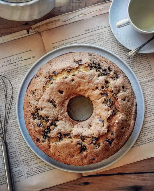 La ciambella per la colazione con farine naturalmente prove di glutine, soffice e goloso con le gocce di cioccolato.