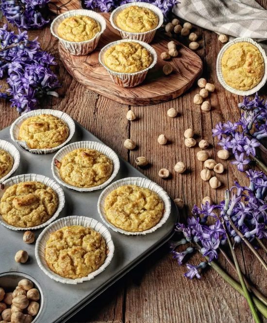muffins ai mandarini e nocciole con farina di castagne, tortine senza glutine dal sapore agrumato, accompagnate da una crema leggera allo yogurt greco