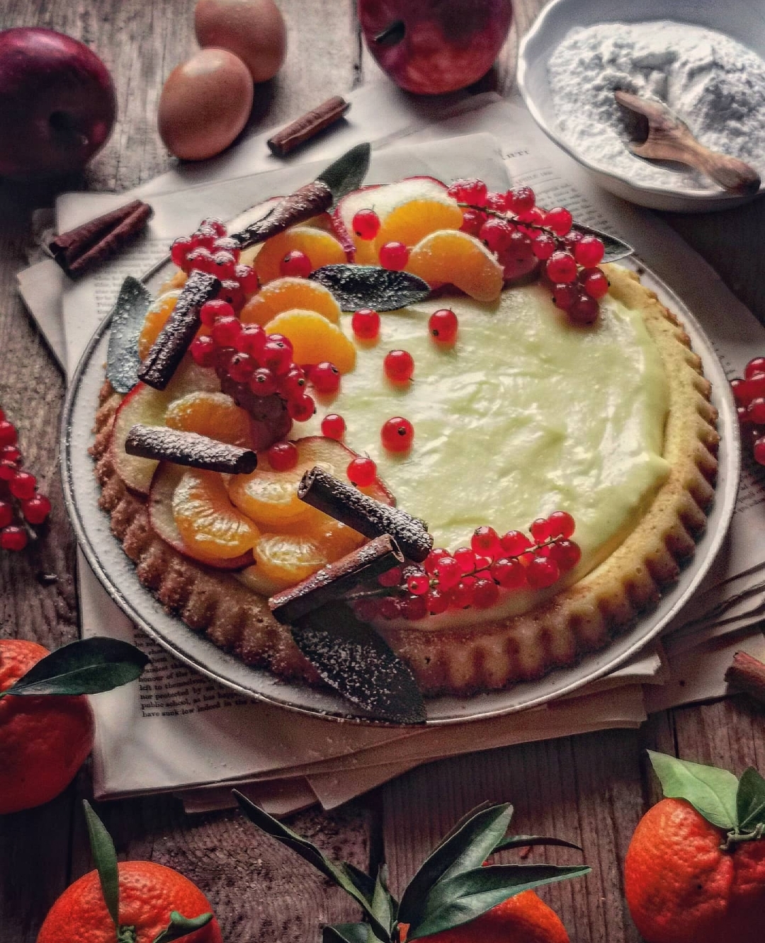Io ho caramellato in un pentolino con acqua e zucchero, delle fettine di mandarino e delle fettine di mela.Ho terminato di decorare la crostata con dei grappolini di ribes, dei tronchetti di cannella, delle foglioline di salvia e una spolverata di zucchero a velo finale.
