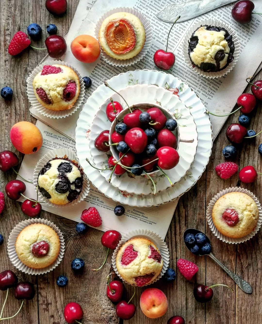 • Riempiteli fino a ¾ e mettete sulla superficie di ogni muffin dei pezzetti di frutta o piccoli frutti, facendoli sprofondare leggermente. Con questo impasto si possono ottenere circa 8, 9 muffin.