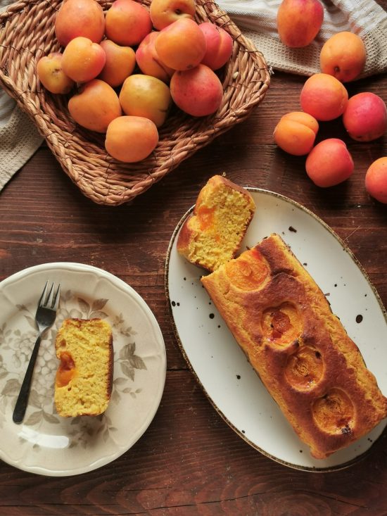 un plumcake visto dall’alto con a lato un piatto con una fetta tagliata e tante albicocche intorno